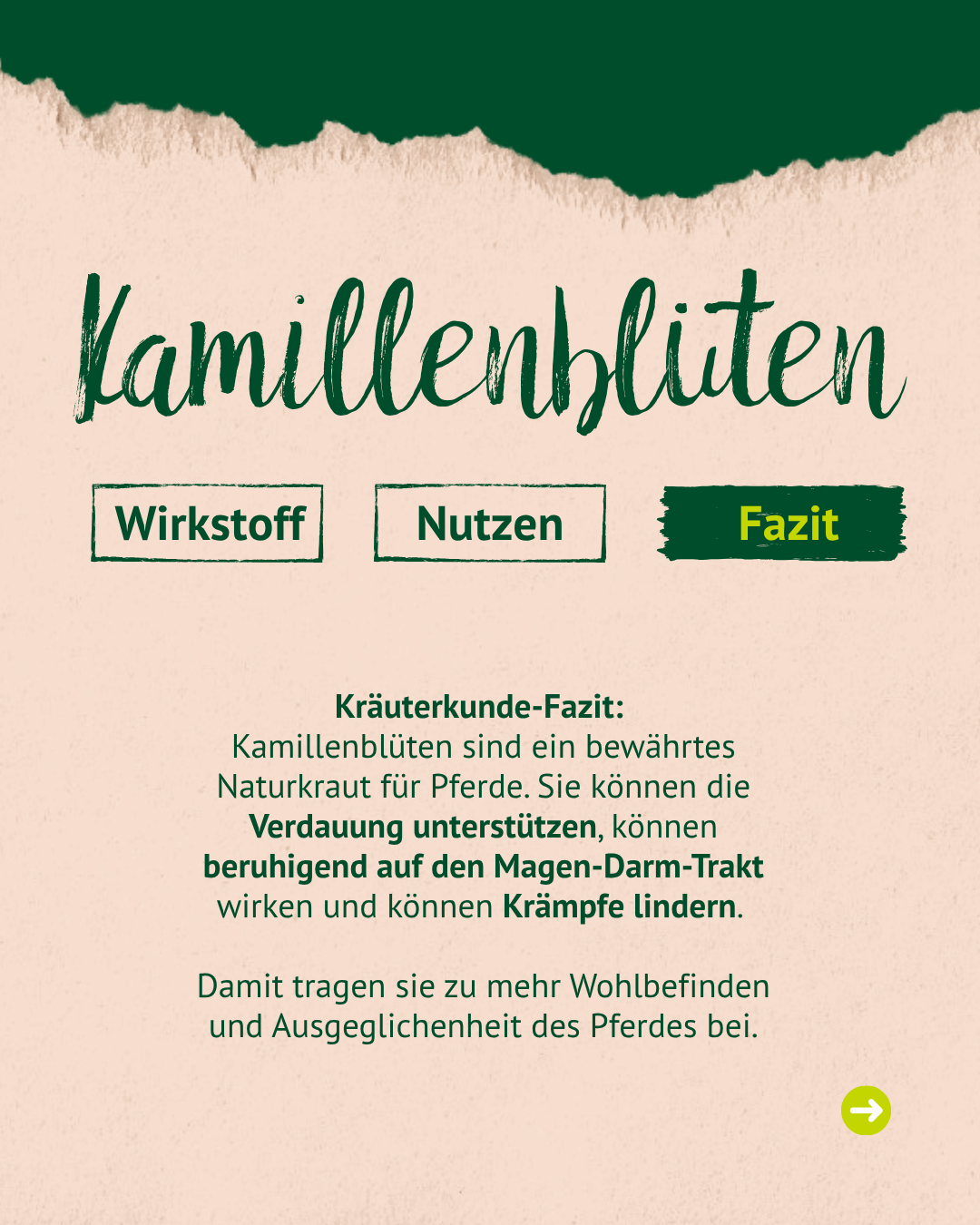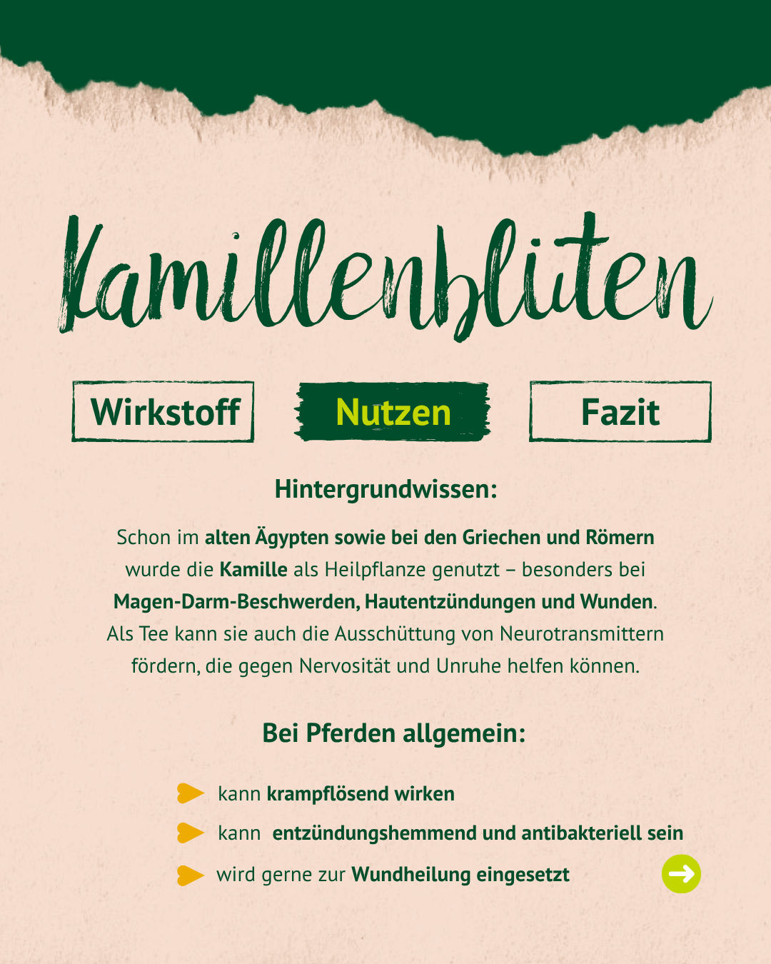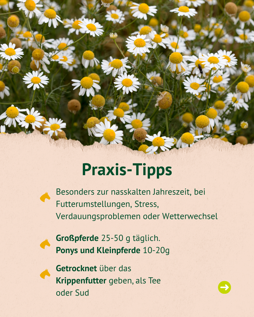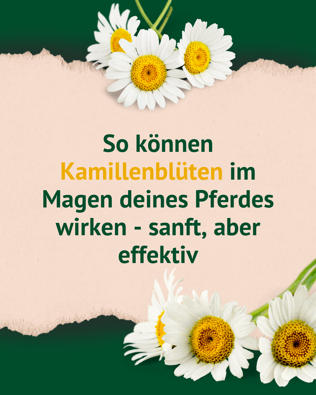 - Beitrag zur Nervenstärke: Die Fütterung von Kamillenblüten kann die Ausgeglichenheit fördern und einen positiven Einfluss auf gestresste oder angespannte Pferde haben, die zu Nervosität oder Unruhe neigen.