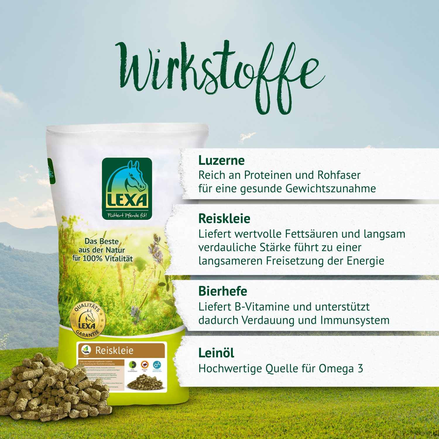 Der LEXA Reiskleie Mix wurde speziell entwickelt, um Pferde auf schonende Weise beim Auffüttern zu unterstützen. Das Produkt kombiniert hochwertige Reiskleie mit ausgewählten Faserkomponenten und bietet dadurch eine ideale Energiequelle – ganz ohne Getreide, Soja oder Melasse. Dank der schonenden Pelletierung ist der Reiskleie Mix besonders staubarm und leicht zu füttern.