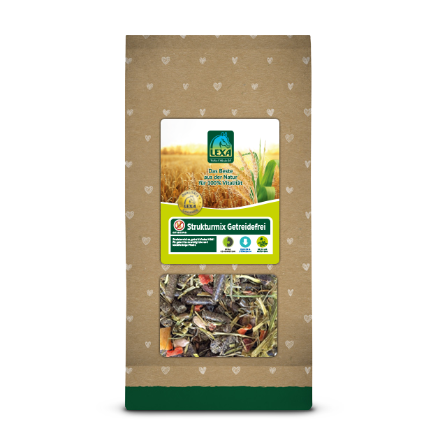 Immer häufiger tritt bei Pferden eine Unverträglichkeit auf Getreide auf, die sich durch zahlreiche Symptome äußern kann. Strukturmix Getreidefrei wurde deshalb speziell für die Ernährungsbedürfnisse getreidempfindlicher Pferde konzipiert. Dieses stärke- und zuckerreduzierte Müsli ist deshalb komplett getreidefrei. Eine moderate Energieversorgung wird durch vitalstoffreiche Luzerne, Sonnenblumenkuchen aus geschälten Körnern und Leinexpeller gewonnen. Die gezielte Rezeptur zeichnet sich durch einen hohen Anteil an essentiellen Aminosäuren aus, die sich positiv auf Vitalität und Muskelstoffwechsel auswirken kann. Der hohe Anteil strukturreicher Luzerne fördert zuverlässig die Kauintensität und unterstützt somit den gesamten Magen-Darm-Trakt. Natürliche Vitalstoffe aus Karottenwürfeln und Rote Beete bringen natürliche Nährstoffe in die Ration. Hochwertiger Schwarzkümmel, Leinöl und eine speziell abgestimmte Kräuterergänzung sowie Kieselgur runden die ausgewogene Rezeptur von Strukturmix Getreidefrei ab. Zusätzlich können Bentonite helfen Toxine und Schwermetalle zu binden und diese auszuscheiden. Strukturmix Getreidefrei enthält keine zugesetzten Mineralstoffe, Vitamine und Spurenelemente und eignet sich somit bestens zur gezielten Kombination mit unserem LEXA Mineralfuttersortiment, um eine individuelle Ergänzung zu ermöglichen.