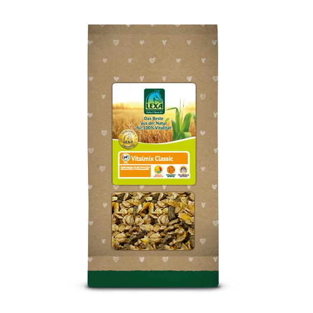 Dieses schmackhafte Allround-Müsli zeichnet sich durch einen hohen Anteil (50 %) reiner hydrothermisch aufgeschlossener Gersten- und Maisflocken aus, die nach Lebensmittelstandard hergestellt werden. Zusätzlich angereichert ist Vitalmix Classic mit schonend getrocknetem Gras aus regionalem Anbau und mit pektinhaltigen, bewährten Futtermitteln, um einen optimalen Faseranteil zu ermöglichen und somit den empfindlichen Darmtrakt des Pferdes zu berücksichtigen. Die ausgewogene Versorgung mit allen lebenswichtigen Mineralstoffen, Vitaminen und Spurelementen ermöglicht einen vielfältigen Einsatz im Bereich von Freizeit- und Sportpferden und ist ebenfalls bestens für größere Bestände geeignet. Vitalmix Classic kann als alleiniges Kraftfutter gefüttert oder ideal mit Getreide ergänzt werden.
